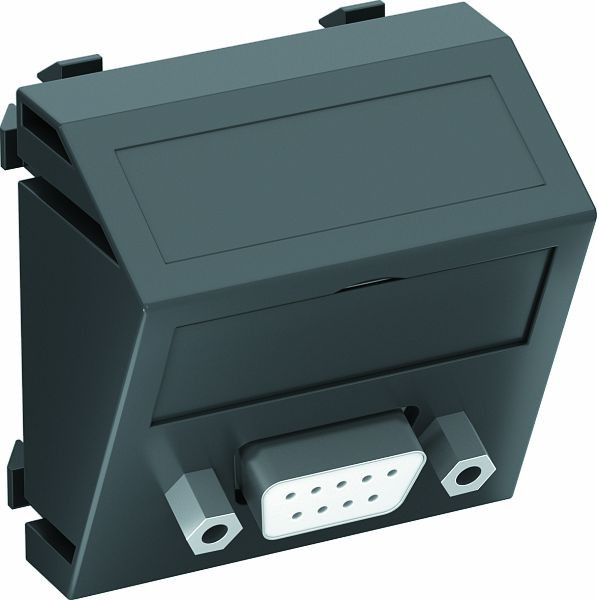Multimediaträger mit einer D-Sub9-Anschlussbuchse, Kabelauslass schräg, mit Beschriftungsfeld, D-Sub9-Buchse (RS232) mit Schraubanschluss. Trägerplatte mit Rastbefestigung, geeignet für den waagerechten und senkrechten Einbau in die Systemumgebung.