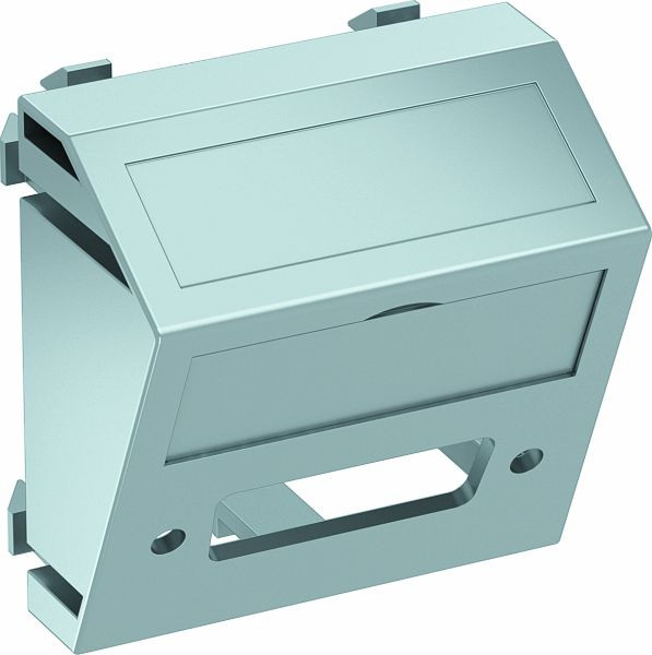 Multimediaträger für einen DVI Steckverbinder, Kabelauslass schräg, mit Beschriftungsfeld, ohne Steckverbinder. Trägerplatte mit Rastbefestigung, geeignet für den waagerechten und senkrechten Einbau in die Systemumgebung.