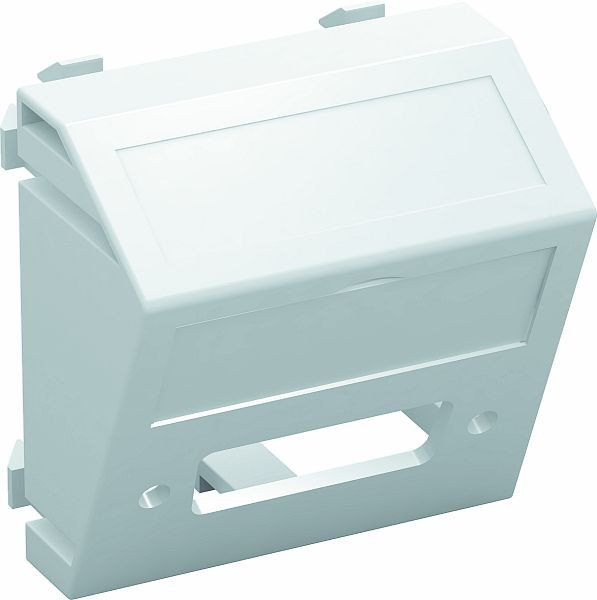 Multimediaträger für einen DVI-Steckverbinder, Kabelauslass schräg, mit Beschriftungsfeld, ohne Steckverbinder. Trägerplatte mit Rastbefestigung, geeignet für den waagerechten und senkrechten Einbau in die Systemumgebung.
