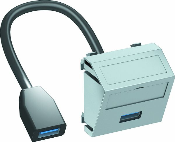 Multimediaträger mit einer USB 3.0-Anschlussbuchse, Kabelauslass schräg, mit Beschriftungsfeld, kurzes USB 3.0 Typ A-Anschlusskabel in Ausführung Buchse-Buchse. Trägerplatte mit Rastbefestigung, geeignet für den waagerechten und senkrechten Einbau in die Systemumgebung.
