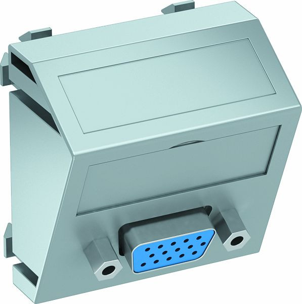 Multimediaträger mit einer VGA-Anschlussbuchse, Kabelauslass schräg, mit Beschriftungsfeld, VGA-Buchse (HD15) mit Schraubanschluss. Trägerplatte mit Rastbefestigung, geeignet für den waagerechten und senkrechten Einbau in die Systemumgebung.