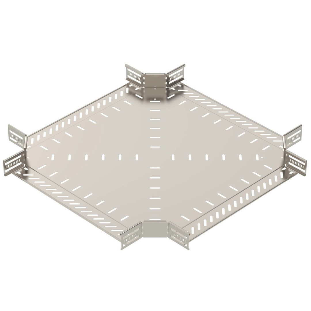 Kreuzung zum Erstellen einer horizontalen Abzweigung, Formteil für rast- und schraubbare Kabelrinnen Seitenhöhe 60 mm. Schraubenlose Montage mit Doppelklemmen oder Schraubverbindung mit Flachrundschrauben FRS und Kombimutter M6. Einsetzbar im Innen- und Außenbereich. Befestigungsmaterial muss separat bestellt werden.