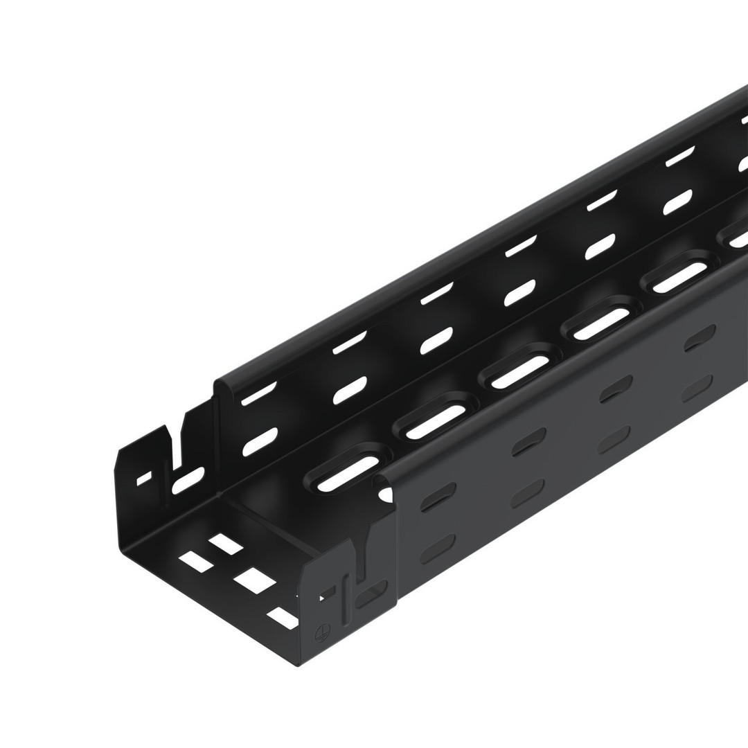 Kabelrinne mit integriertem Schnellbefestigungssystem. Bandverzinkte Oberfläche, pulverbeschichtet in tiefschwarz (RAL 9005). Durchgängige Seitenlochung von 7 x 20 mm für die Installation zusätzlicher Verbindungs- und Montagebauteile. Mit 11-mm-Lochung im Boden für die direkte Gewindestangenabhängung. Nutzlänge 3.000 mm.