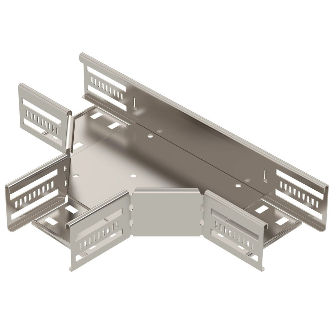 T-Stück zum Erstellen einer horizontalen Abzweigung, Formteil für rast- und schraubbare Kabelrinnen Seitenhöhe 60 mm. Schraubenlose Montage mit Doppelklemmen oder Schraubverbindung mit Flachrundschrauben FRS und Kombimuttern M6. Einsetzbar im Innen- und Außenbereich. Befestigungsmaterial muss separat bestellt werden.