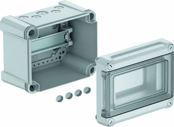 Kleinverteiler zur Aufputz-Montage, für die Strom-Unterverteilung im Innen- und geschützten Außenbereich, gemäß IEC 439-3. Mit vormontierter 35-mm-Hutprofilschiene. Schutzart IP66 und Schutzgrad IK07. Transparenter Deckel zum Schrauben, mit Ausschnitt.