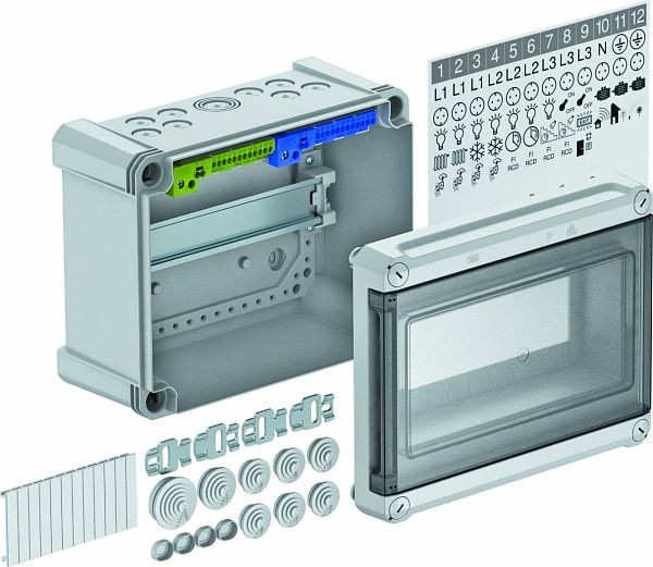 Kleinverteiler mit Klemmleiste zur Aufputz-Montage, für die Strom-Unterverteilung im Innen- und Außenbereich, gemäß IEC 439-3. Mit vormontierter 35-mm-Hutprofilschiene. Schutzart IP66 und Schutzgrad IK08. Transparenter Deckel zum Schrauben, mit Ausschnitt.