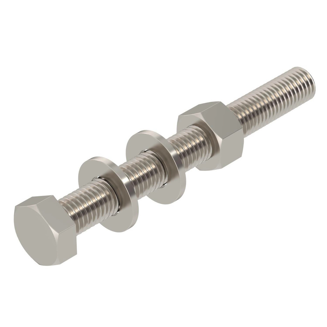 Sechskantschraube zur universellen Befestigung von Konstruktionsbauteilen. Inklusive Sechskantmutter und 2 Unterlegscheiben.