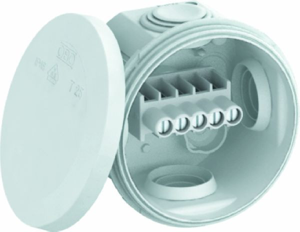 Kabelabzweigkasten mit Klemmleiste zum Verbinden von Kabeln und Leitungen im Innenbereich und geschützten Außenbereichen. Runde Form mit Einsteckdichtungen an den Seiten und Ausschlageinführungen im Boden. Geeignet für die Wand-/ Deckenmontage, die Montage auf Montageblechen und Gewinde im Boden. Mit der Möglichkeit zur Innenbefestigung. Mit festsitzendem Klemmdeckel. Hergestellt aus halogenfreien und UV-resistenten Materialien.