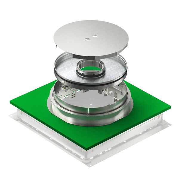 Nivellierbare und entkoppelbare runde Kassette für den fußbodenbündigen und fugenlosen Geräteeinbau in Unterflur-Anschlussdosen UZD 350-4 (Mindesteinbautiefe 165 mm)/UGD55 350-3 (Mindesteinbautiefe 140 mm). Für alle Zementestriche geeignet. Kassettenrahmen mit integriertem Schalkörper und Nivellierfunktion. Der Kassettenrahmen wird über 4 Länglöcher auf die Oberkante des Fußbodenbelags nivelliert. Für trocken, feucht oder nass gepflegte Fußböden geeignet. Die Kassette wird durch Befestigungswinkel im Montagedeckel während der Estrich-/Terrazzoarbeiten fixiert und ist im eingebauten Zustand in alle Richtungen entkoppelt. Der Kassettenrahmen besteht aus Edelstahl mit einer 25 mm tiefen Bodenbelagsaussparung im Deckel.
