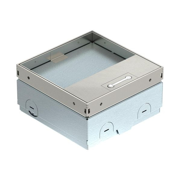 Quadratische Bodensteckdose für den Einsatz in trocken gepflegten System- und Estrichböden im Innenbereich. Einbaugehäuse mit vorgeprägten Einführungsöffnungen für Rohre (M20/M25). Oberteil durch 4 Nivellierstützen auf Oberkante Bodenbelag einstellbar. Die Mindesteinbautiefe beträgt 75 mm, der Nivellierbereich + 30 mm. Im Bodenbelag sichtbarer Rahmen und Deckel aus Edelstahl. Deckel mit Bodenbelagsaussparung und Bürstenauslass zur Leitungsführung. Leergehäuse für ein Modul 45®-Installationsgerät und eine Datenbuchse. Der Datentechnikträger für die Datenbuchse ist separat zu bestellen, der Platz ist im Auslieferungszustand mit einer Blindplatte verschlossen.