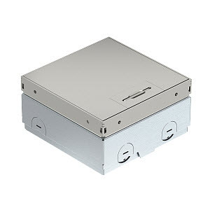 Quadratische Bodensteckdose für den Einsatz in trocken gepflegten System- und Estrichböden im Innenbereich. Einbaugehäuse mit vorgeprägten Einführungsöffnungen für Rohre (M20/M25). Oberteil durch 4 Nivellierstützen auf Oberkante Bodenbelag einstellbar. Die Mindesteinbautiefe beträgt 75 mm, der Nivellierbereich + 30 mm. Im Bodenbelag sichtbarer Rahmen und Deckel aus Edelstahl. Deckel mit Dekorplatte. Im Lieferumfang ist eine Schutzkontaktsteckdose enthalten. Eine Datenbuchse kann optional in der Datentechnikplatte eingebaut werden. Im Auslieferungszustand mit einer Blindplatte verschlossen.