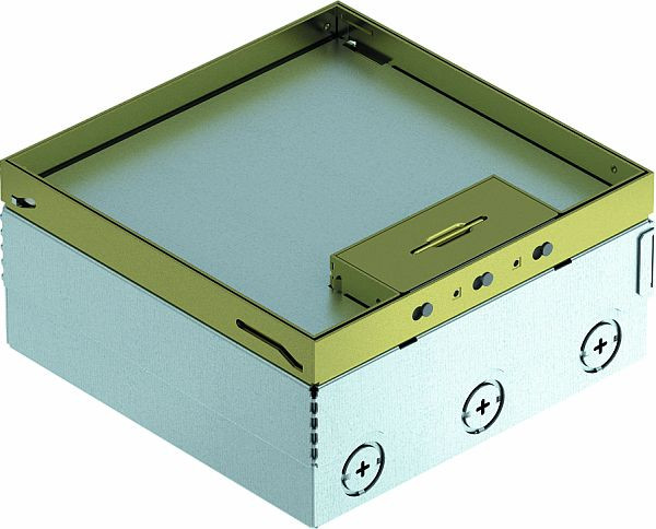 Quadratischer Bodentank für den Einsatz in trocken gepflegten Hohlböden und Estrichböden im Innenbereich. Einbaugehäuse mit vorgeprägten Einführungsöffnungen für Rohre (M25). Leergehäuse für bis zu 2 Universalträger UT3 für bis zu 6 Modul 45 ® -Einbaugeräte. Oberteil durch 4 Nivellierstützen auf Oberkante Bodenbelag einstellbar. Die Mindesteinbautiefe beträgt 95 mm, der Nivellierbereich + 30 mm.