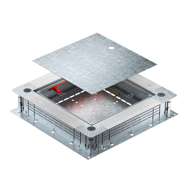 Zug- und Abzweigdose für estrichüberdeckte Unterflur-Installationskanäle mit Seitenwänden aus Stahlblech. Zur Montage von Einbaueinheiten im Montagedeckel (separat zu bestellen). Lässt sich stufenlos mit der Schnellnivellierung auf eine Estrichnennhöhe von 80 - 160 mm nivellieren. Der Estrich kann bündig an die Estrichabzugskante angearbeitet werden. Mit schalltechnischer Entkopplungsmöglichkeit nach der Estrichverlegung und mit Systemzubehör auch für Schwerlastanwendung verwendbar. Einführung der Kabel und Leitungen mit dem 2-teiligen EÜK-Kanal.