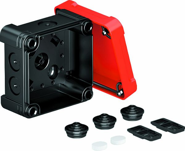 | Kurzbeschreibung | Kabelabzweigkasten mit rotem Deckel 95x95x60 Polycarbonat schwarz / rot |