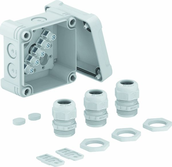 Inklusive Klemmleiste, 3 Kabelverschraubungen V-TEC M20 und 3 Gegenmuttern.