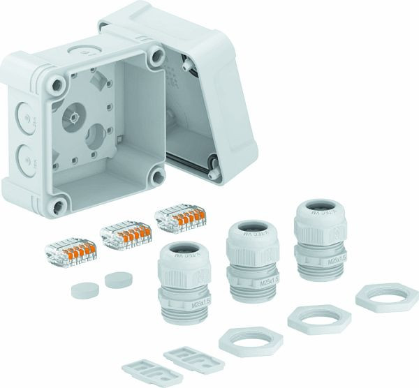 Kabelabzweigkasten mit Klemme zum Verbinden von Kabeln und Leitungen im Innen- und Außenbereich. Quadratische Form mit Ausschlageinführungen. Geeignet für die Wand-/ Deckenmontage mit der Möglichkeit zur Außenbefestigung, Innenbefestigung oder Montage über die Eckdome. Besonders schlagfest mit IK09. Deckel mit Schnellverschluss, plombierbar. Hergestellt aus halogenfreien und UV-resistenten Materialien.
