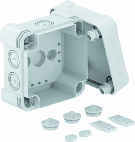 Kabelabzweigkasten zum Verbinden von Kabeln und Leitungen im Innen- und Außenbereich. Quadratische Form mit Ausschlageinführungen. Geeignet für die Wand-/ Deckenmontage mit der Möglichkeit zur Außenbefestigung, Innenbefestigung oder Montage über die Eckdome. Besonders schlagfest mit IK09. Deckel mit Schnellverschluss, plombierbar. Hergestellt aus halogenfreien und UV-resistenten Materialien.
