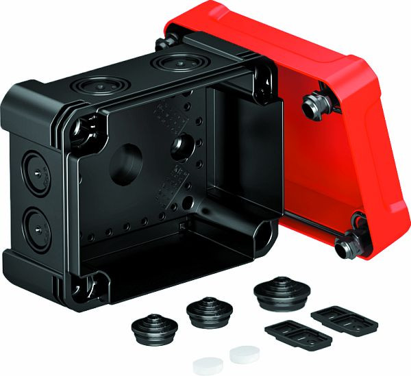 | Kurzbeschreibung | Kabelabzweigkasten mit rotem Deckel 150x116x86 Polycarbonat schwarz / rot |