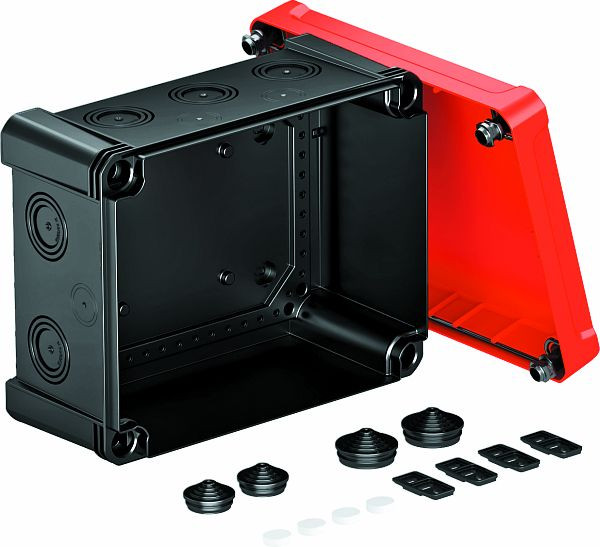 | Kurzbeschreibung | Kabelabzweigkasten mit rotem Deckel 240x191x125 Polycarbonat schwarz / rot |