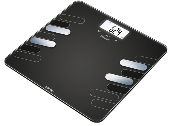 Vernetzung zwischen Smartphone und Waage, Bluetooth® low energy technology - Messwerte immer im Blick, inklusive App zum Download, Elektroden aus gebürstetem Edelstahl, weiß hinterleuchtetes Display, Ziffernhöhe 26 mm, Körpergewicht, -fett, -wasser, Muskelanteil, Knochenmasse und Kalorienanzeige (BMR/AMR) und BMI, Einteilung: 100 g/0,1%, 5 Aktivitätsgrade, 8 Benutzerspeicher mit automatischer Benutzererkennung, Einschalttechnik: Quick-Start, Umstellung von kg/lb/st, inkl. 2 x 1,5V Batterien AAA, 5 Jahre Garantie