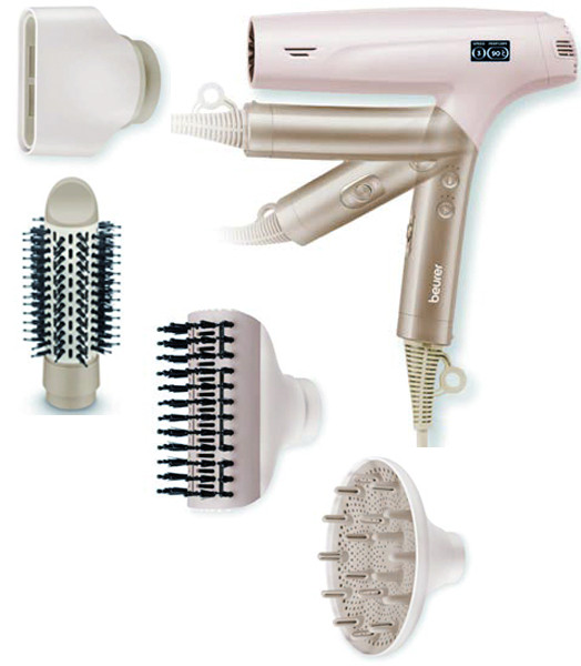 klappbarer Haartrockner mit leistungsstarkem Digitalmotor, 4 wechselbare Aufsätze (Stylingdüse, Diffusor, Volumenrundbürste, Stylingbürste), hochwertiges LCD Display zeigt 3 verschieden einstellbare Modi an (Protect, Styling, Perform)