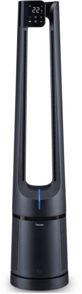2-in-1 Luftreiniger und Ventilator Luftreinigung durch ein 3-schichtiges Filtersystem (Vorfilter + HEPA H13 Filter + Aktivkohle), smarter Automatikmodus: erkennt Partikel mit einer Größe von 2,5 µm und passt die Reinigungsleistung an die Raumluft an, farbiger Indikator zeigt die aktuelle Raumluftqualität an, 5 wählbare Programme: Basic, Nature, Sleep, Child und Automatic für eine individuelle Nutzung, Kühlung durch Luftverwirbelung, 12 Lüfterstufen, Anzeige der aktuellen Raumtemperatur, Lights-Off Funktion: Display und Indikatorlicht per Knopfdruck jederzeit ausschaltbar, Timerfunktion: 1 - 12 Stunden, auswechselbare Filter mit Filterwechselanzeige, magnetische Fernbedienung, 3 Jahre Garantie