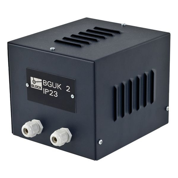 Universal-Stahlblechgehäuse mit Kühlrippen für Schutzart IP20/IP23 - Integriertes Schienensystem zum einfachen Einbau unterschiedlicher Produktgrößen (BGUK 30 - BGUK 60) - Ausgezeichneter Korrosionsschutz und hohe Abriebfestigkeit durch pulverbeschichtete Oberflächen RAL 5008 - Mit Kühlöffnungen für optimale Wärmeabfuhr - Geschlossene obere Frontplatte für BGUK 10 - 60 für individuelle Anschlussmöglichkeiten (optional) - Integrierte Kranösen