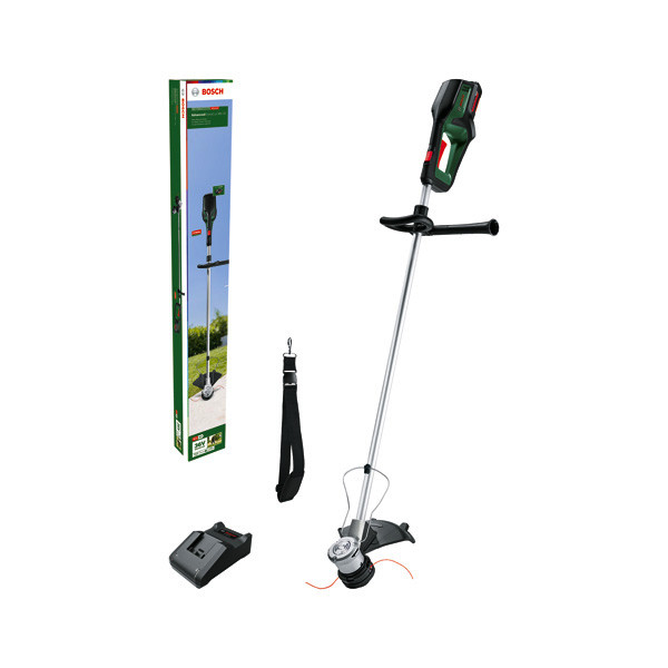Akku-Rasentrimmer AdvancedGrassCut 36V-33. Kabelfreies, kraftvolles Trimmen in überwucherten, verwilderten Bereichen. Bürstenloser Motor liefert Hochleistung für anspruchsvolles Trimmen. Haltbare Materialien und eine bürstenlose Technologie sorgen für eine längere Lebensdauer. Gut ausbalancierte, verfeinerte Ergonomie für leichtes und trotzdem kraftvolles Trimmen. EasyWind-Spule für schnellen und einfachen Fadenwechsel. Smarte Elektronik sorgt für eine übergangslose Leistung und hält dabei die Drehzahl. Syneon Technology für optimale Kraft und Ausdauer nach Bedarf. 36V POWER FOR ALL ? der Akku für alle Bosch 36V Home & Garden-Gartengeräte. 1 x Akku 36V 2,0Ah. Ladegerät AL 36V-20. Schultergurt. Kartonschachtel