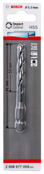 Der HSS-Spiralbohrer Impact Control ermöglicht besonders mit Schlagbohrern beste Bohrarbeiten in Metall. Der extrem widerstandsfähige Körper ist sehr robust. Der Spiralbohrer ist aus massivem Metall präzisionsgefräst und geschliffen, die Spiralnut ist oxidbeschichtet. Die Oberflächeneigenschaften ermöglichen glattes Bohren bei geringerem Verschleiß. Er eignet sich für legierten und unlegierten Stahl, Gussstahl, Gusseisen, Sintereisen, Nichteisenmetalle, Metallblech und Kunststoff.