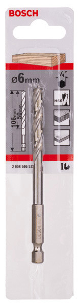 | Kurzbeschreibung | Holzspiralbohrer mit 1/4-Zoll Sechskantschaft, 6 x 63 x 106 mm |