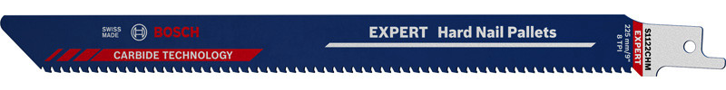 Herausragende Lebensdauer in Paletten mit harten Nägeln! Reverse-Spitze verhindert Verklemmen, Verbiegen und Rückschlag Schnelle Schnitte und Langlebigkeit sind für die Reparatur von Paletten unerlässlich. Die Nägel in Paletten sind jedoch im Laufe der Jahre härter geworden und fordern jetzt einen heftigen Tribut von den Sägeblättern. Das EXPERT Hard Nail Pallets S1122CHM-Blatt? wurde speziell zum Schneiden von harten Nägeln in Paletten entwickelt und bietet unübertroffene Fähigkeiten, Produktivität und Langlebigkeit. Harte Nägel haben Reparaturarbeiten an Paletten bisher immer zum Stillstand gebracht, Blätter zerstört und die Produktivität beeinträchtigt. Mit dem Bosch EXPERT Hard Nail Pallets S1122CHM-Säbelsägeblatt schneidest du einfach durch sie durch. Überragende Lebensdauer dank Bosch Carbide Technology