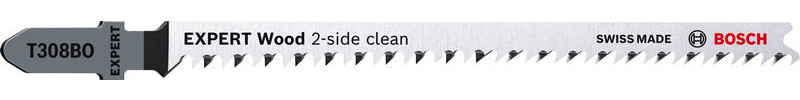 Hochpräzises, ausrissfreies Schneiden von Holz! Extrascharfe Zähne durch Präzisionsschliff Unter Tischlern und Schreinern war es schon immer eine Kunst sicherzustellen, dass der sichtbare Teil des Arbeitsmaterials die ?saubere Seite? eines Stichsägenschnitts zeigt. Manchmal muss man das Werkstück zum Sägen umdrehen. Oder die Stichsäge sägt von der Rückseite, um die gewünschte Schnittqualität auf der Sichtseite zu haben. Oder du verwendest das EXPERT Wood 2-side clean-Blatt, das dank seiner Zahngeometrie auf beiden Seiten einen perfekten, ausrissfreien Schnitt bietet. Mit seinen besonders scharfen, präzisionsgeschliffenen Zähnen eignet sich das Bosch EXPERT Wood 2-side clean-Stichsägeblatt gut zum Schneiden von Weichholz mit einer Dicke von bis zu 50 mm. Möbelschreiner können ein perfektes Ergebnis erzielen und verlieren nicht nach jedem Stichsägenschnitt Zeit durch Schleifen. Erhältlich für gerade Schnitte (T308B), für Kurvenschnitte (T308BO) und für genaue Winkelschnitte (T308BP). Ausrissfreie Schnitte mit 2-side Clean Geometry