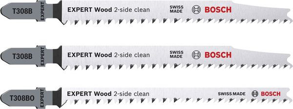 Hochpräzises, ausrissfreies Schneiden von Holz! Extrascharfe Zähne durch Präzisionsschliff Die ?saubere Seite? eines Stichsägeschnitts auf der sichtbaren Seite des Werkstücks zu gewährleisten, ist seit jeher eine Kunst für Tischler und Schreiner. Manchmal muss man das Werkstück zum Sägen umdrehen. Oder die Stichsäge sägt von der Rückseite, um die gewünschte Schnittqualität auf der Sichtseite zu haben. Oder Du verwendest die Stichsägeblätter aus dem EXPERT Wood Set. Dank ihrer doppelten Zahnreihe ermöglichen sie einen perfekten, ausrissfreien Schnitt auf beiden Seiten. Mit ihren extra scharfen, präzisionsgeschliffenen Zähnen eignen sich die Bosch EXPERT Wood Stichsägeblätter hervorragend zum Schneiden von Weichholz bis zu einer Dicke von 50 mm. Möbelschreiner können ein perfektes Ergebnis erzielen und verlieren nicht nach jedem Stichsägeschnitt Zeit durch Schleifen. Mit den Stichsägeblättern aus dem Set kannst Du gerade Schnitte (T308B), Kurvenschnitte (T308BO) und präzise Winkelschnitte (T308BP) ausführen. Ausrissfreie Schnitte mit 2-side Clean Geometry