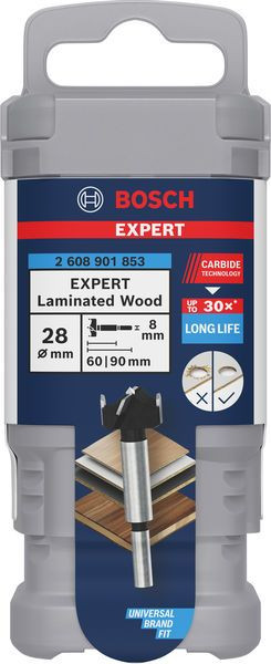 Überragende Lebensdauer beim Bohren in Schichtholz! Feingeschliffene, scharfe Hochleistungs-Carbide-Spitze Die Montage von Scharnieren erfordert sauber gesetzte Bohrungen, für die wiederum ein Scharnierbohrer benötigt wird, der lange seine Schärfe hält und perfekte Bohrungen ohne Splitter ermöglicht. Dafür haben wir den EXPERT Laminated Wood entwickelt ? unseren außergewöhnlich langlebigen Scharnierbohrer, mit dem sich saubere und präzise Löcher in Schichtholz und Sperrholz bohren lassen. Ob saubere, splitterfreie Löcher für Türscharniere, Senkbohrungen oder andere Arten von Bohrungen in Holz, mit dem EXPERT Laminated Wood und seinen scharfen Carbide-Schneidkanten schaffen Sie jede Arbeit mit Leichtigkeit. Der Bohrer wurde für den Einsatz an Stationärmaschinen entwickelt. Überragende Lebensdauer dank Bosch Carbide Technology