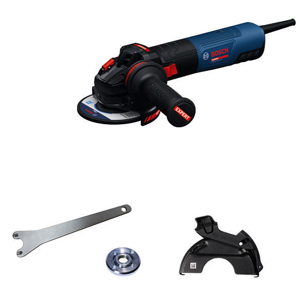 Winkelschleifer EXWS20-125TSB, Der EXPERT EXWS20-125TSB liefert mit seiner hohen Eingangsleistung von 2.000 W maximale Leistung. Dieses EXPERT-Werkzeug bietet dank seines bürstenlosen Motors eine lange Lebensdauer und einen geringeren Wartungsaufwand. Es besticht durch seine herausragende Ergonomie und hat den geringsten Griffumfang im größten Leistungsbereich für kleine Winkelschleifer. Der EXPERT EXWS20-125TSB bietet den besten Anwenderschutz seiner Klasse. Dafür sorgen verschiedene fortschrittliche Schutzfunktionen, wie z. B. KickBack Control (stoppt den Motor bei blockierendem Werkzeug), Drop Control (schaltet den Motor ab, wenn das Werkzeug herunterfällt), Wiederanlaufschutz (verhindert das Wiederanlaufen nach einer Stromunterbrechung), Überlastungsschutz (schützt vor Überhitzen), Sanftanlauf und ein Bremssystem. Du kannst jede Aufgabe mit Hilfe der LED-Leuchte, die den aktuellen Werkzeugzustand angibt, optimieren. Dieses Werkzeug besitzt eine verbesserte Direktkühlung und Temperaturüberwachung und bietet einen besseren Staubschutz mit abnehmbarem Staubfilter. Der EXPERT EXWS20-125SB ist das ideale Werkzeug für Metallbauer, die im industriellen Umfeld arbeiten. Hauptanwendungsbereiche sind Schleifen/Trennen von Gusseisen, Schleifen von Formen, Entgraten von Oberflächen sowie Bearbeiten von Schweißnähten und Spritzern. Vibration Control-Zusatzhandgriff (1 602 025 0A0). Spannmutter (1 603 345 043). Zweilochmutterndreher (1 607 950 052). SDS-Schnellspannmutter (1 603 340 031)