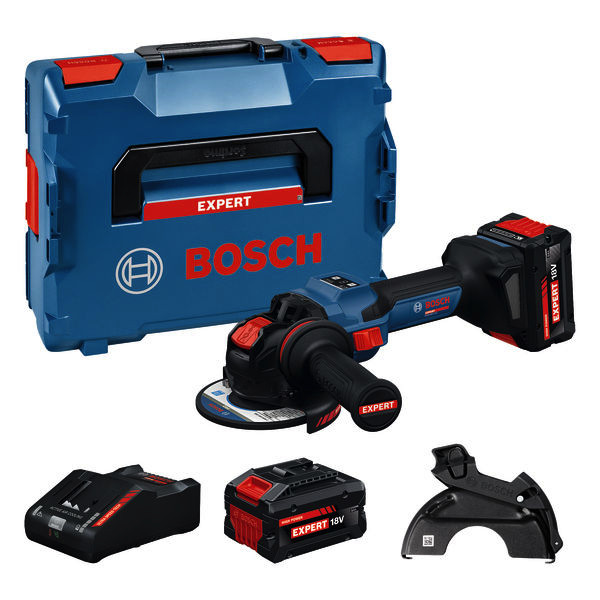 Akku-Winkelschleifer mit X-LOCK EXWX18V-15S, Der kabellose Winkelschleifer EXPERT EXWX18V-15S 18V liefert hervorragende Leistung mit einer äquivalenten kabelgebundenen Leistung von 1500 W. Dieses Werkzeug besitzt einen BITURBO BRUSHLESS-Motor, der für die extreme Leistung der EXPERT-Akkus ausgelegt ist. Es ermöglicht den schnellen und bequemen Zubehörwechsel mit dem werkzeuglosen X-LOCK-Klicksystem. Dieser Winkelschleifer bietet ausgezeichneten Anwenderschutz mit Intelligent Brake, Kickback Control, Drop Control und Restart Protection. Und du profitierst von einer hervorragenden Kontrolle über das Werkzeug dank seines ergonomischen Designs und der HMI für die vorbeugende Werkzeugwartung. Dieser EXPERT-Winkelschleifer ist unverzichtbar bei Arbeiten an Öltanks, Windrädern, Türmen und Brücken. Und er ist auch für lange Werkstücke geeignet. Das reicht von Bewehrungsstäben mit einem Durchmesser von mehr als 20 mm bis hin zu Beton. Kompatibel mit dem Bosch Professional 18V-System und mit der markenübergreifenden AMPShare Akku-Allianz. Verwende EXPERT Akkus, um maximale Leistung zu erhalten. L-BOXX 162 (1 600 A03 8TU). Vibration Control-Zusatzhandgriff (1 602 025 0A0). 2 x EXBA18V-80 (1 607 A35 1MF). EXAL18V-160 (1 600 A03 D3A). L-BOXX Einsatz für EXWS/EXWX18V-15S/PS (6 082 850 7MG). 1 x Expert-Reihe Schleifschutz, 125 mm (1 619 P19 582). 1 x Expert-Reihe Trennclip auf Schutzhaube, 125 mm (1 619 P19 584)