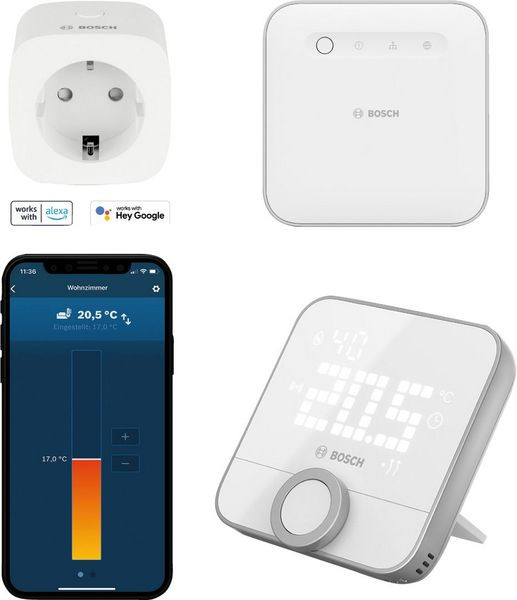 Beschreibung: Einzelraumregelung Starterset für intelligente Steuerung von Bosch dezentralen Elektroheizungen (Infrarot, Konvektor) im Smart Home, integriert und steuerbar über Bosch Smart Home App, bestehend aus: