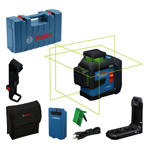 Linienlaser GLL 80-33 G, Der GLL 80-33 G Professional ist ein intuitiver Linienlaser für genaueste Ausrichtung und Nivellierung. Dank IP65-Schutz und einem langlebigen, gummiverstärkten Gehäuse und Laserfenstern ist er geschützt gegen Staub und Wasser, so dass du selbst auf den härtesten Baustellen sorgenfrei arbeiten kannst. Das neue Tastaturdesign erlaubt eine leichte Wahl aller Laserlinien und bietet einen zusätzlichen Energiesparmodus für eine längere Batterielaufzeit. Darüber hinaus bietet die Dual Power-Funktion die Flexibilität, zwischen dem Li-Ion-Akku BA 3.7V 3.0Ah XL und Alkali.-Batterien Typ AA zu wechseln, so dass du dir keine Gedanken über Ausfallzeiten wegen einer leeren Batterie machen musst. Der BA 3.7V 3.0Ah XL kann während der Verwendung geladen werden und sorgt für einen nahtlosen Arbeitsablauf ohne Stromunterbrechungen. Der GLL 80-33 G ist ideal für verschiedenste Anwendungen, einschließlich das Aufstellen von Trockenwänden, Ausrichten von Fensterrahmen und Montieren von Zwischendecken. Die große Batterieanzeige ermöglicht eine mühelose Überwachung des Ladeniveaus, während drei 360°-Laserlinien zeitgleich waagerechte und senkrechte Nivellierung erlaubt - so sparst du Zeit und Mühe. Der Linienlaser erkennt automatisch den optionalen Laser-Empfänger LR 7 Professional. Dadurch kannst du sofort mit der Arbeit beginnen und den Arbeitsbereich auf bis zu 80 Meter erweitern. Die hellgrünen Laserlinien bieten eine viermal bessere Sichtbarkeit als rote Linien für leichteres Nivellieren - egal an welchem Arbeitsort. Handwerkerkoffer. BA 3.7V 3.0Ah XL und USB-C®-Kabel (1 600 A03 1FZ). Universalhalter LB 10 Professional. Deckenklemme DK 20 Professional (1 608 M00 C4C). Laserzieltafel. Tasche