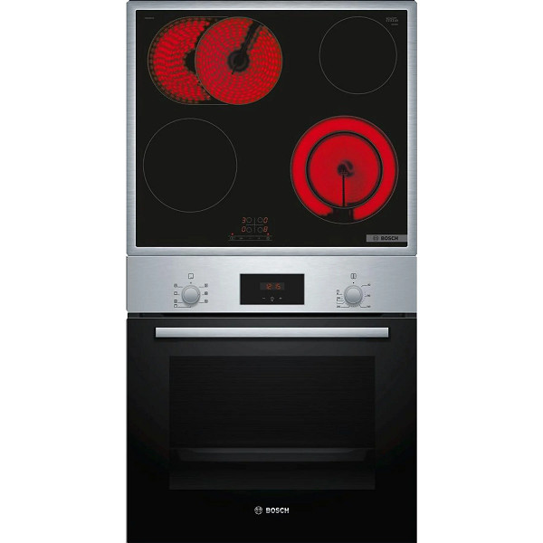 Das Backofenset HBD231VR61 von Bosch überzeugt mit einem Backraumvolumen von 66 Litern und schickem Design. Das Set besteht aus dem Einbau-Backofen HBF133BR0 und dem Elektro-Kochfeld PKN645BA2E. 5 Heizarten machen das Kochen, Backen, Schmoren und Garen zu einer Leichtigkeit und die 3D Heißluft sorgt für perfekte Ergebnisse dank optimaler Wärmeverteilung auf bis zu drei Ebenen gleichzeitig. Reinigung und Pflege des Garraums gestalten sich dank der emaillierten Backofenwände besonders einfach. Das Elektro-Kochfeld mit Glaskeramik-Oberfläche bietet vier Kochzonen. In puncto Sicherheit überzeugt das Kochfeld des HBD231VR61 mit einer Restwärmeanzeige und der Backofen mit einer Kindersicherung und einem Kühlgebläse.