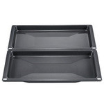 Die beiden Universalpfannen HEZ530000 von Bosch im schmalen Format eignen sich ideal zum Zubereiten zweier unterschiedlicher Gerichte, außerdem stellen sie ein Fettauffanggefäß beim Grillen dar