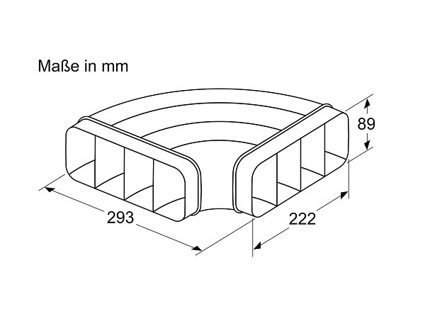 Der Flachkanalbogen für Kochfeldabzüge ermöglicht eine horizontale 90°-Winkelverbindung und ist speziell als Zubehör für Abluftsysteme konzipiert. Mit den Maßen 89 x 293 x 293 mm (H x B x T) und einer Öffnung von 89 x 222 mm sorgt er für eine effiziente Luftführung und flexible Installation bei Kochfeldabzügen.