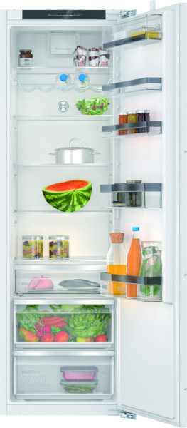 elektronische Temperaturregelung über LED ablesbar, optisches und akustisches Warnsystem bei geöffneter Tür, Kühlteil: SuperKühlen, LED-Beleuchtung, 7 Abstellflächen aus Sicherheitsglas, davon 4 höhenverstellbar, Spezial-Flaschenrost, glanzverchromt, MultiBox: transparente Schublade mit Wellenboden, 1 VitaFresh XXL Schublade mit Feuchtigkeitsregulierung - hält Obst und Gemüse vitaminreich und länger frisch, 1 VitaFresh Schublade - hält Fisch und Fleisch länger frisch; Türanschlag rechts, wechselbar, Softeinzug, Made in Germany
