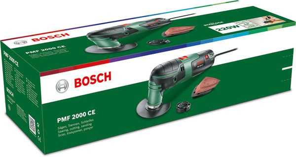 Multifunktionswerkzeug PMF 2000 CE. Vielseitige Lösung für verschiedenste DIY-Arbeiten. Leistungsstarker 220-W-Motor mit elektronischer Drehzahlvorwahl. Bosch MagnetHold-System unterstützt beim Zubehörwechsel. Es ist umfangreiches Starlock-Zubehör für vielfältige Anwendungen erhältlich. Tiefenanschlag für präzises Segmentsägen. Schneiden, Sägen, Schleifen, Schaben, Fräsen, Raspeln und Polieren verschiedenster Materialien. 4-stufiger Tiefenanschlag für Segmentsägeblätter (2 609 256 C61). BIM Segmentsägeblatt Wood and Metal, 85 mm, ACZ 85 EB (2 609 256 943). Deltaschleifplatte 93 mm, AVZ 93 G (2 609 256 956). Deltaschleifblatt-Set (2 609 256 A54). Karton