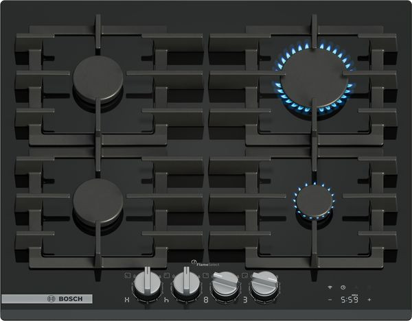 Design Hartglas-Oberfläche, schwarz Rahmen: Facette vorne Halbdurchgehende gusseiserne Topfträger Vollmetall-Drehwähler beleuchtet Benutzerfreundlichkeit FlameSelect: stelle die Flamme in neun definierten Stufen präzise ein. TopControl-Digitalanzeige: zeigt die gewählte Leistungsstufe und Restwärme an. Bedienknebel, vorne: leicht zugängliche und bedienbare Knebel im Frontbereich für müheloses Drehen. 1-Hand-Zündung: um die Flamme zu entzünden, drücke und drehe einfach den Knebel. Wecker: ein Alarm ertönt am Ende der eingestellten Zeit (z. B. für Pasta). Brenner und Leistung 4 Gas-Kochstellen, stufenweise regulierbar Vorne links: Normalbrenner bis zu 1.75 kW (abhängig von der Gasart) Hinten links: Normalbrenner bis zu 1.75 kW (abhängig von der Gasart) Hinten rechts: Starkbrenner bis zu 3 kW (abhängig von der Gasart) Vorne rechts: Sparbrenner bis zu 1 kW (abhängig von der Gasart) Reinigung Abnehmbare Schwertknebel: vereinfacht die Reinigung zwischen den Knebeln. Spülmaschinengeeignete Topfträger: einfach im Geschirrspüler zu reinigen. Halbdurchgehende gusseiserne Topfträger: geringes Gewicht und kompakte Form bei gleichzeitig hoher Stabilität durch durchgehende Oberfläche. Sicherheit Thermoelektrische Zündsicherung: verhindert weiteren Gasfluss beim Erlöschen der Flamme. Restwärmeanzeige 4-fach: zeigt an, welche Brennerteile und Pfannenträger noch heiß sind. Vernetzung Home Connect : überprüfe von unterwegs, ob das Kochfeld ausgeschaltet ist und nutze viele weitere Funktionen in der Home Connect App. Kochfeldbasierte Haubensteuerung (mit passendem Dunstabzug) : aktiviert automatisch die Dunstabzugshaube beim Kochen, dank der WiFi-Verbindung von Kochfeld und Dunstabzug. Smart Hood Automatic: der Dunstabzug passt die Lüfterleistung automatisch an die Einstellungen des Kochfeldes an (mit passendem Dunstabzug und angeschlossenem Home Connect-Konto). Die Lautstärke der Touch Control Steuerung kann je nach Vorliebe in der Home Connect App angepasst werden. Installation (Gasarten & Messungen) Verwendbar für: Erdgas L/LL G25/20 mbar (DE) Erdgas H/E 20 mbar, E+ 20/25 mbar Erdgas H 25 mbar (HU) Erdgas L 25 mbar (NL) Flüssiggas G30, 31 28-30/37 mbar Flüssiggas G30 37 mbar (PL) Flüssiggas 50 mbar Voreingestellt auf Erdgas (20 mbar) Düsensatz für Flüssiggas-Düsen (28-30/37 mbar) beiliegend. Düsen für alle anderen Gasarten können über den Kundendienst bestellt werden. Für einen Düsenwechsel wende dich bitte an den Kundendienst. Abmessungen des Gerätes (HxBxT mm): 54 x 590 x 520 Erforderliche Nischenmaße (HxBxT mm): 45 x 560 x (480 - 490) Minimale Arbeitsplattenstärke: 20 mm Netzkabel: 1 m Gesamtanschlusswert: 7.5 kW