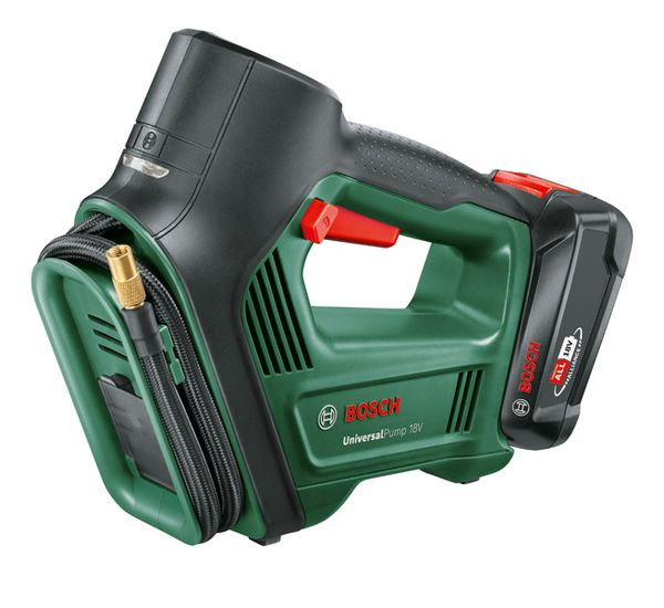 Akku-Druckluftpumpe UniversalPump 18V. Schnelles Aufpumpen von Auto-, Motorrad-, Wohnwagen- und Fahrradreifen. Schnelles Aufpumpen mit bis zu 30 l/min auf bis zu 10,3 bar. mit intuitiver Steuerung per Fingerdruck. Handliche, kompakte Pumpe mit unterbrechungsfreier Messung über ein beleuchtetes Manometer. Aufbewahrung direkt am Werkzeug: Verschiedene Adapter sind ordentlich an der Werkzeugvorderseite verstaut. Pumpt größere Gegenstände auf, die einen hohen Druck erfordern (wie Reifen und Bälle). Beleuchteter Ventilbereich und Akkustatusanzeige. 1 x Akku PBA 18V 2.0Ah. Französisches Ventil. Volumenadapter. Ballnadel. Ladegerät AL 18V-20. Karton