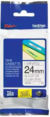 Brother TZe-151 Schriftband - schwarz auf transparentOriginal Brother TZe-151 laminiertes Schriftband - 24 mm breit, 8 m langSchwarz auf transparentLaminiert durch patentierten Hinterbanddruck24 mm breit, 8 m langWisch-, wetter- und kratzfestTemperatur-, chemie- und UV-beständigBeständige, perfekt lesbare Ergebnisse