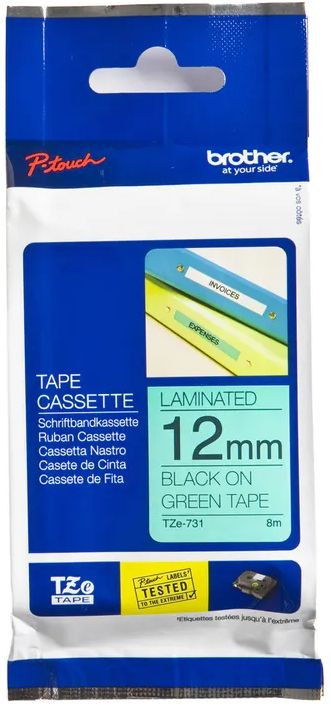 Brother TZe-731 Schriftband - schwarz auf grünOriginal Brother TZe-731 laminiertes Schriftband - 12 mm breit, 8 m langSchwarz auf grünLaminiert durch patentierten Hinterbanddruck12 mm breit, 8 m langWisch-, wetter- und kratzfestTemperatur-, chemie- und UV-beständigBeständige, perfekt lesbare Ergebnisse