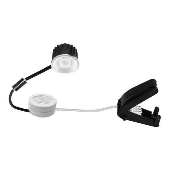 Set bestehend aus LED-Einsatz 3CCT, CRI>80 und Rundkonverter, Phasenabschnitt dimmbar, mit Anschlussbox, schwarz / aluminium matt. Set inkl. Rundkonverter für 230 V-Netzspannung, Phasenabschnitt dimmbar, Maße Konverter: D 51 x H 24 mm Ausführung: Plug&Play, Material: Aluminium / PMMA / Kunststoff, Schutzart raumseitig: nach DIN EN 60529: IP20, Schutzklasse: (EN 61140) II, Leistung: 7,5 W, Anzahl der Leuchtmittel / Fassungen: 1 Stück, Lichtstrom: 951 lm, Farbtemperatur: von 2.700 K bis 4.000 K, Abstrahlwinkel: 50°, Mit Betriebsgerät: Ja, Dimmbar: Ja, Art der Dimmung: Phasenabschnitt.