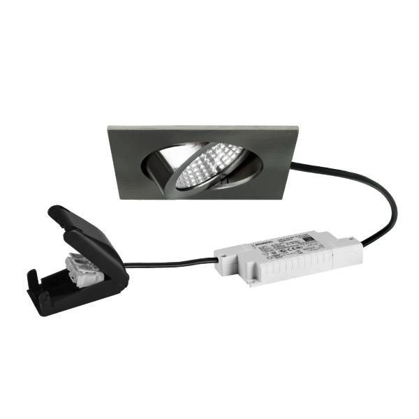 LED-Einbaustrahlerset, Phasenabschnitt dimmbar, mit Anschlussbox, nickel matt, quadratisch. Ausgeführt in kompakter Bauform für werkzeuglose Schnellmontage zum Deckeneinbau. Montageart: Einbaumontage, Montageort: Deckenmontage, Material: Aluminium / Polycarbonat, Schutzart raumseitig: nach DIN EN 60529: IP20, Schutzklasse: (EN 61140) II, Spannung: 230V AC 50Hz, Leistung: 6 W, Anzahl der Leuchtmittel / Fassungen: 1 Stück, Lichtstrom: 630 lm, Farbtemperatur: 3.000 K, Lichtfarbe: weiß, Abstrahlwinkel: 38°, Verstellbarkeit: schwenkbar, Mit Betriebsgerät: Ja, Dimmbar: Ja, Art der Dimmung: Phasenabschnitt.