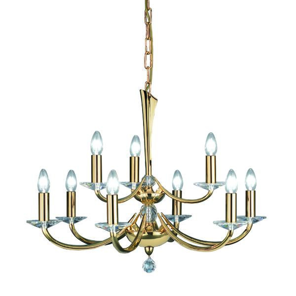 Pendelleuchte gold glänzend, mit Kristallen, gold glänzend, sonstige. Ausführung in kompakter Bauform für die harmonische Implementierung in stimmige, architektonische Raumkonzepte. Anbau-Pendelleuchte, mit Kristallen. Ausführung: E14, Montageart: Anbaumontage, Montageort: Deckenmontage, Material: Messingguss / Kristall, Schutzart raumseitig: nach DIN EN 60529: IP20, Schutzklasse: (EN 61140) I, Spannung: 230V AC 50Hz, Leistung: 40 W, Anzahl der Leuchtmittel / Fassungen: 9 Stück, ohne Betriebsgerät, Art der Dimmung: sonstige.